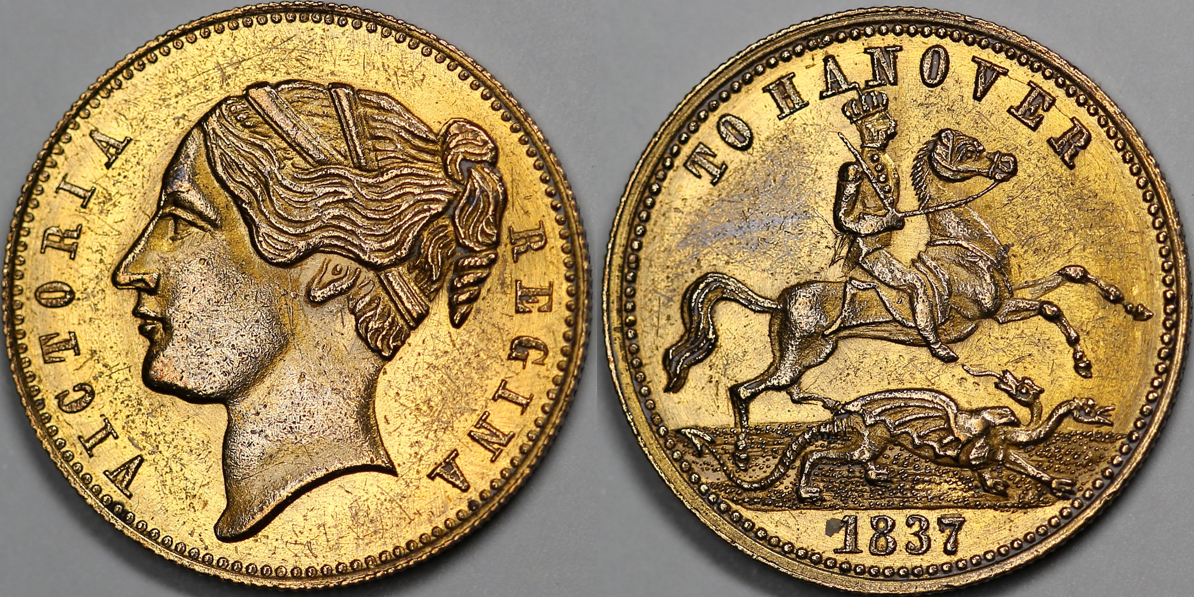 The history behind these pieces is that when Victoria was crowned as Queen, she was unable to fulfil the role of King of Hanover under Salic Law, due to the fact that she was a female. Her unpopular Uncle (Ernest Augustus, the Duke of Cumberland) who was the oldest male heir to the throne was sent off to Hanover instead to fulfil the role, and the counters/tokens were produced to commemorate (celebrate) his departure. Such was his unpopularity that many of the tokens on closer inspection actually depict a monkey on horseback which was intended to portray the Duke.