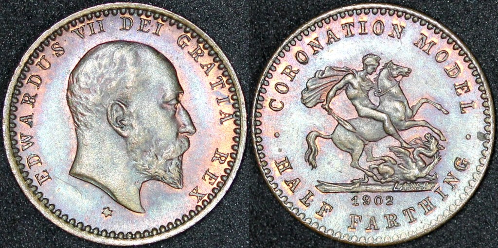 The finish of these coins was matte, completely different to the usual polished brilliance of earlier sets (and for that matter) later sets. The process to create the matte proofs was developed in the preceding decade in Belgium and was adopted by the Royal Mint to make the 1902 sets. Coin-collecting folklore says that the Royal Mint workers disliked the finish greatly and wiped the coins as they came out of the presses on their leather aprons to give them a more brilliant appearance.