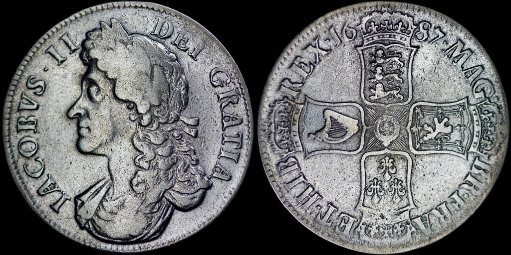 There were two issues. The first “large” issue consisted of sixpences, shillings and half crowns. The second, “small” issue consisted of shillings, half crowns and crowns (5 shillings). Some of the second issue were over-struck on large issue pieces, with shillings struck over sixpences, half crowns on shillings and crowns on half crowns. The most notable feature of the coins is the date, because the month of striking was also included. This was so that after the war (in the event of James’ victory), soldiers would be able to claim interest on their wages, which had been withheld from proper payment for so long.