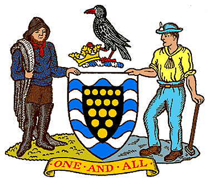 A bearded sea fisherman represents the county’s maritime connections, and he stands opposite the tin miner, a reminder of Cornwall’s great mineral wealth and pioneering industrial heritage. Above the shield rests the Chough, a relative of the Jackdaw with blue-black plumage and a distinctive curved red bill. The Chough used to proliferate on the cliffs of Cornwall, but is now almost extinct in the county, although conservationists are working to re-establish it through breeding in captivity. The bird rests its claw on a Ducal Coronet. The Duchy of Cornwall, which includes land in Devon, London (for example, the Oval cricket ground) and the Scilly Isles, has long been the inheritance of the sovereign’s eldest son, as is the title of Duke of Cornwall.