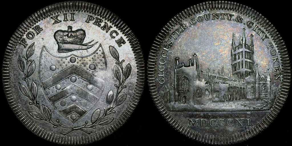 Obverse: Arms of Gloucester, with crest. FOR XII PENCE. No period in the legend, and the tassel is between the I’s of value.