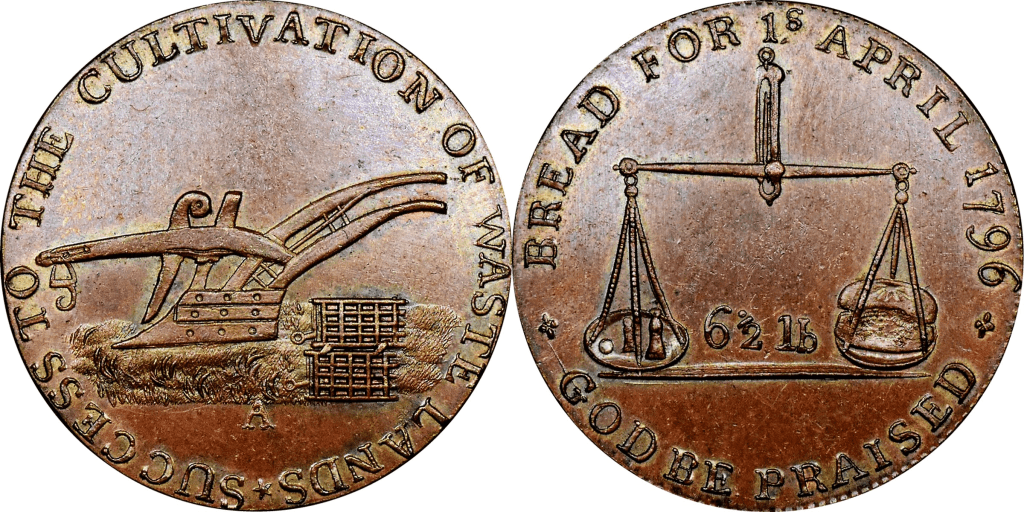 Reverse: Pair of scales, 6 1/2 lb, BREAD FOR 1s APRIL 1796. GOD BE PRAISED.