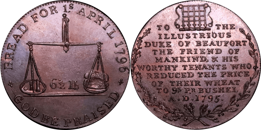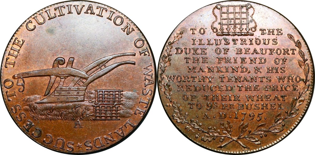 Reverse: TO THE ILLUSTRIOUS DUKE OF BEAUFORT THE FRIEND OF MANKIND & HIS WORTHY TENANTS WHO REDUCED THE PRICE OF THEIR WHEAT TO 9s PR. BUSHEL A.D.