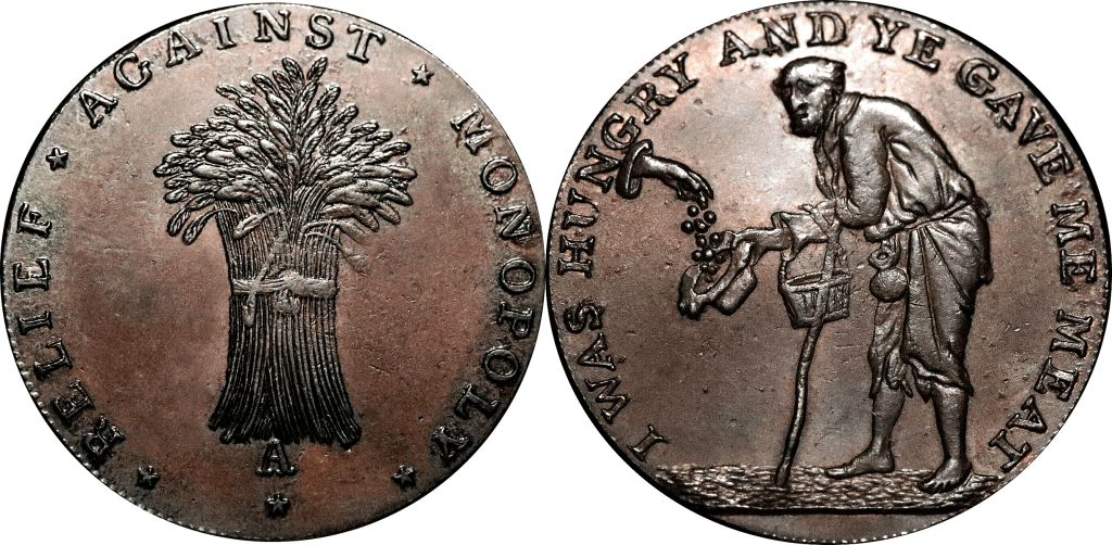 The Badminton series are not currency tokens, but were struck to perpetuate the memory of the Duke of Beaufort, and to illustrate incidents connected with a period of scarcity of corn, and are all rather scarce.
