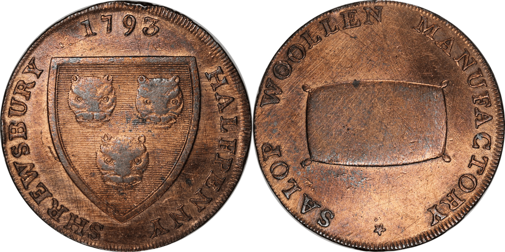 Reverse: A woolpack. SALOP WOOLLEN MANUFACTORY *. The top righthand corner of woolpack points between the A and the N.