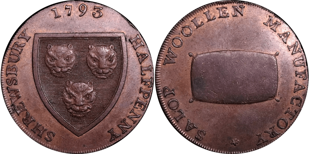 Obverse: Shield of arms of the borough of Shrewsbury. The legend beneath the shield is more divided. SHREWSBURY HALFPENNY 1793