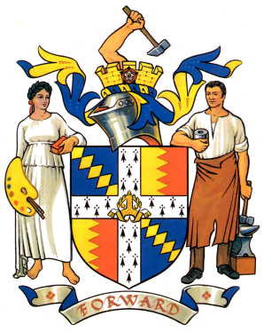 To the old arms a bishops mitre (commemorating the 16th century Bishop Vesey) was added in the center of the shield and the Tudor Rose (marking Henry VIII’s granting of a charter to Sutton Coldfield in 1528) on the mural crown.