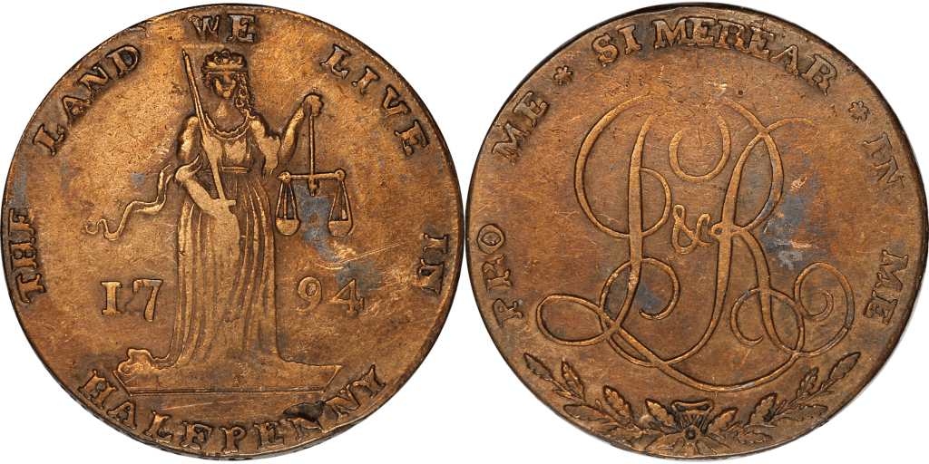 Obverse: A figure of Justice standing, holding sword and scales, dividing the date, which is 1794. The hand holding the scales is close to the letter L i n “LIVE”. THE LAND WE LIVE IN HALFPENNY