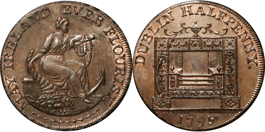 Reverse: A register stove, DUBLIN HALFPENNY. Ex: 1795